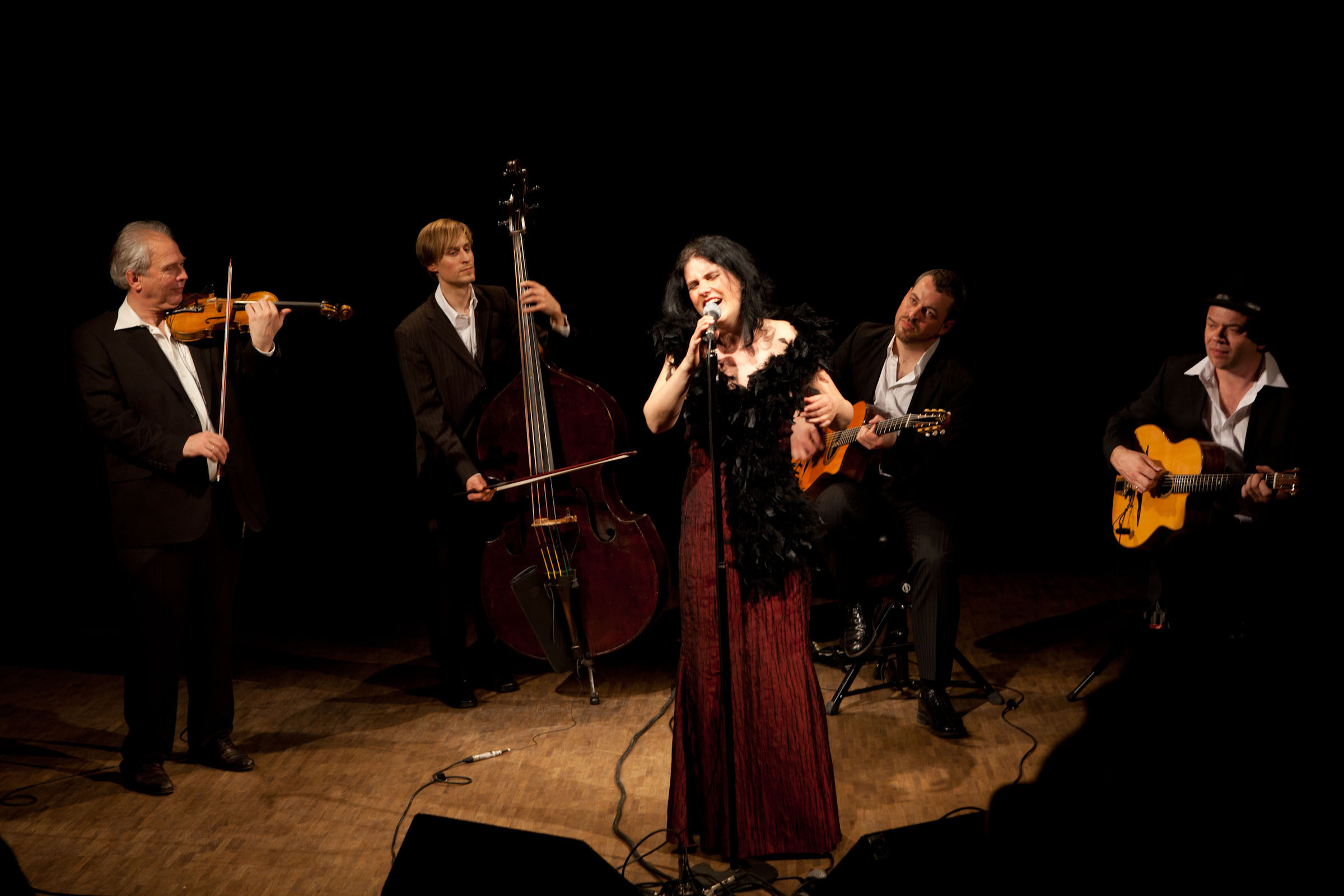 Noch schnell ein Küsschen auf die Geige und sie legen los mit ihrem furiosen "Gypsy-Jazz" und der Spaß daran guckt ihnen aus allen Knopflöchern. Kein Wunder, denn sie alle sind absolute Meister ihrer Instrumente. Frank Wekenmann ist Mitglied bei David Orlowskys Klezmorim und hat bei zahlreichen Theaterprojekten, CD- und Filmmusikproduktionen mitgewirkt, James Geier an der Rhythmusgitarre spielt in Musicalproduktionen, Kontrabassist Steffen Hollenweger in Bigbands, Jazz- und Latinformationen und Matthias Buck, Orchestermusiker in der Württembergischen Philharmonie Reutlingen, genießt sichtlich seinen Ausflug als rasanter Teufelsgeiger, ob im Wettstreit mit dem Gitarristen oder mit der Sängerin Katalin Horvath, die mit ihrer vitalen Präsenz und ihrer ausdrucksstarken Stimme der Gruppe ihren eigenen Stempel aufdrückt. Im Stile Django Reinhardts reisen sie durch das alte Europa, beginnen mit Helmut Zacharias' "Schönes Wetter heute", brechen mit Heinz Rühmann "die Herzen der stolzesten Frau'n", wandern be"swingt" ins Reich der Musette-Walzer: "Wir haben kein Akkordeon, aber wir haben ja unseren Geiger." Schmeichelnd guckt die "schöne Isabella aus Kastilien" aus einem Pasodoble hervor, entführt urplötzlich zu Bizets Carmen, bevor es mit dem "Schwanengesang eines alten Seebären" zurückgeht zu den Comedian Harmonists. Wehmütig singt die Geige, unter Lächeln schluchzend, wechselt aberwitzig zu Django Reinhardts "Hungaria" und da tritt die Sängerin auf den Plan mit einem melancholischen Csardas, der bald sprühend vital wird. Wunderbar suggestiv ist ihre Stimme, wenn sie eine Ballade, ein russisches Zigeunerlied singt. Jede einzelne Nummer möchte man beschreiben, ob die schmachtende "Caprisonne" oder Adriano Celentanos feurigen Song "Azzurro" oder Charles Trenets tiefsinniges Chanson "Que reste-t-il des nos amours?" Man darf nur hoffen, dass die Gruppe bald wiederkommt – versprochen hat sie's.